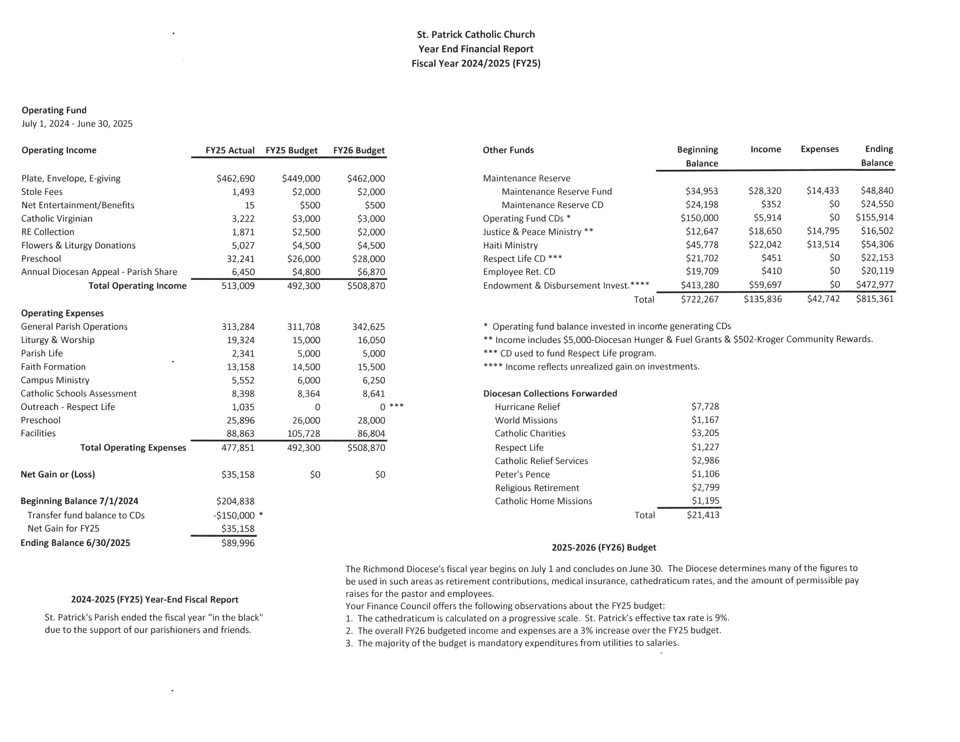 The Richmond Diocese's fiscal year begins on July 1 and concludes on June 30. The Diocese determines many of the figures to be used in such areas as retirement contributions, medical insurance, cathedraticum rates, and the amount of permissible pay raises for the pastor and employees.